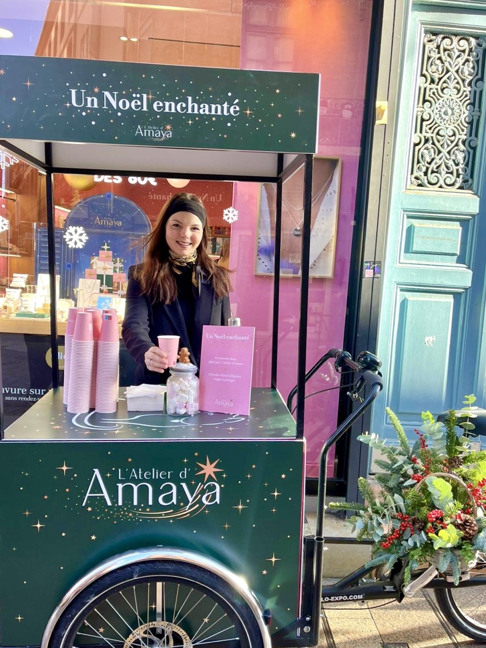 Activation retail > Animation stop trottoir > Triporteurs publicitaires > Distribution de chocolats chauds pour les fêtes de Noël > Velo Expo pour L’Atelier d’Amaya