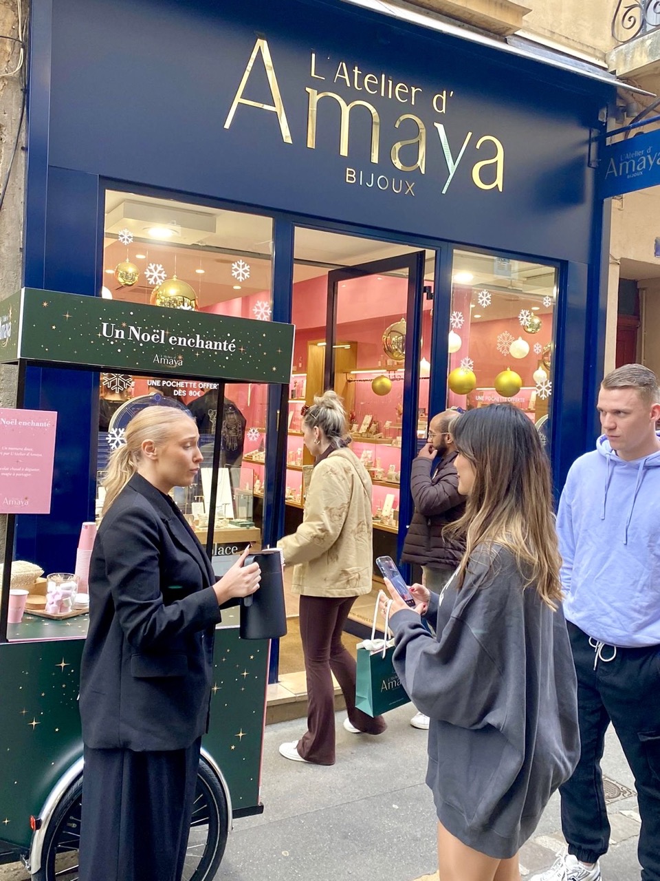 Velo Expo pour L’Atelier d’Amaya. Campagne nationale d’activation retail à l’occasion de la préparation des Fêtes de fin d’année. Affichage mobile, information, animation retail stop-trottoir, distribution de chocolats chauds avec vélo triporteur personnalisé. Objectifs : visibilité ciblée, drive-to-store, augmentation des ventes